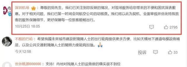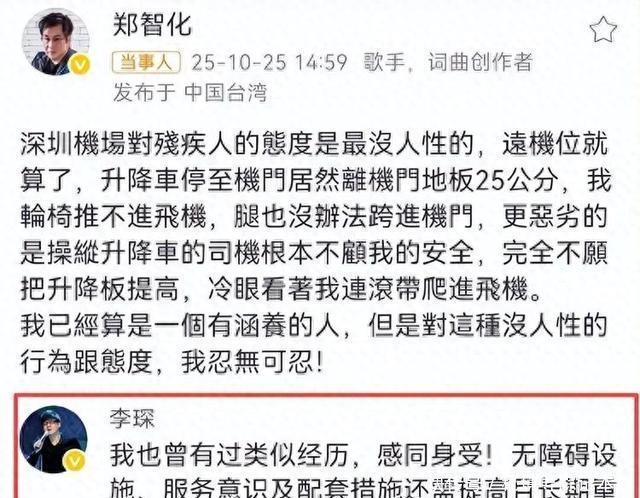 连大陆歌手李琛都火速赶来站队:“我太懂这种滋味了,感同身受!” 这位唱《窗外》成名的歌手同样腿脚不便,他一发声,更坐实了“机场服务差”的印象,#深圳机场无障碍服务形同虚设#的话题很快冲上热搜前排。 深圳机场的反应倒是快,当天傍晚就在评论区道歉,说会立刻核查整改。这波操作反而让更多人觉得“肯定是机场理亏”,不少人跑到机场官微底下喊“开除那个冷血司机”,还有人翻出郑智化早年的励志故事感慨:“当年唱着不屈服的水手,如今却在机场受这种委屈。”